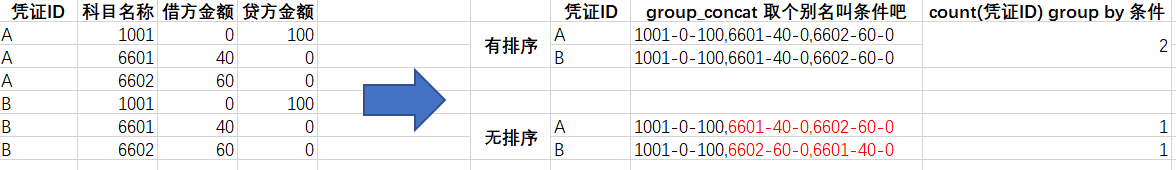 目前使用group_concat不支持排序,那么如果想要找出完全相同的两组数据,比如两张相同凭证,请问有类似的解决方案吗?