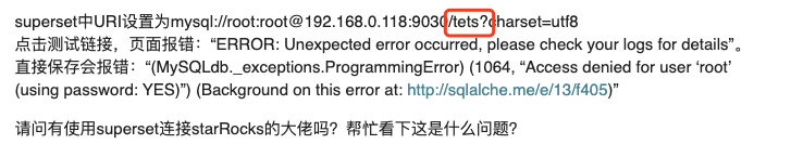 请问有使用superset连接starRocks的大佬吗?帮忙看下这是什么问题?