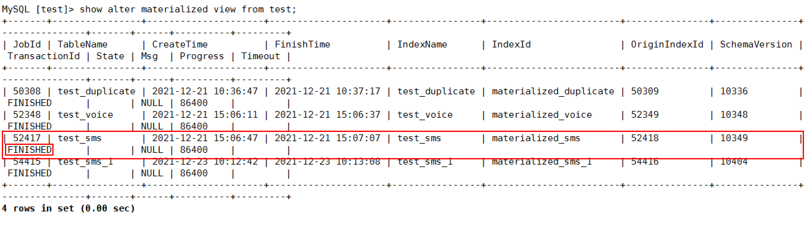 后续查询有命中么?您使用的是哪个版本呢?可以通过该命令确认物化视图是否创建成功 SHOW ALTER MATERIALIZED VIEW FROM db_name;