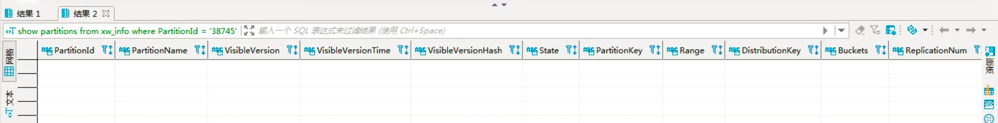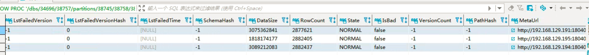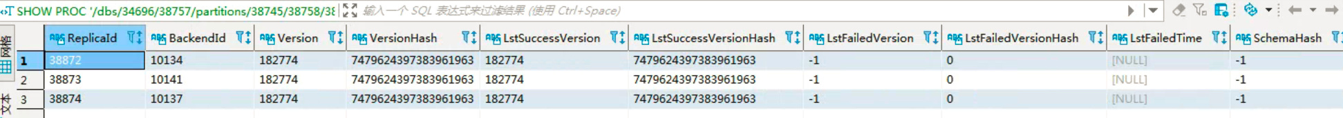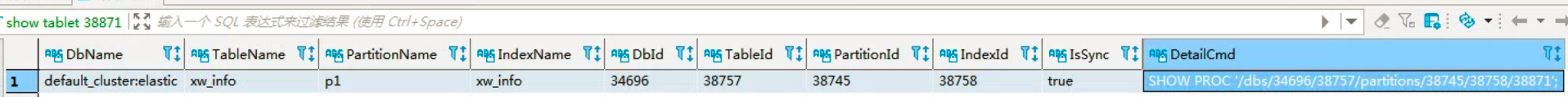 show tablet 38871结果;将结果中的DetailCmd执行,查看副本的情况。取到命令1中的PartitionId,执行show partitions from dates where PartitionId = id; 请将以上查询结果补充下