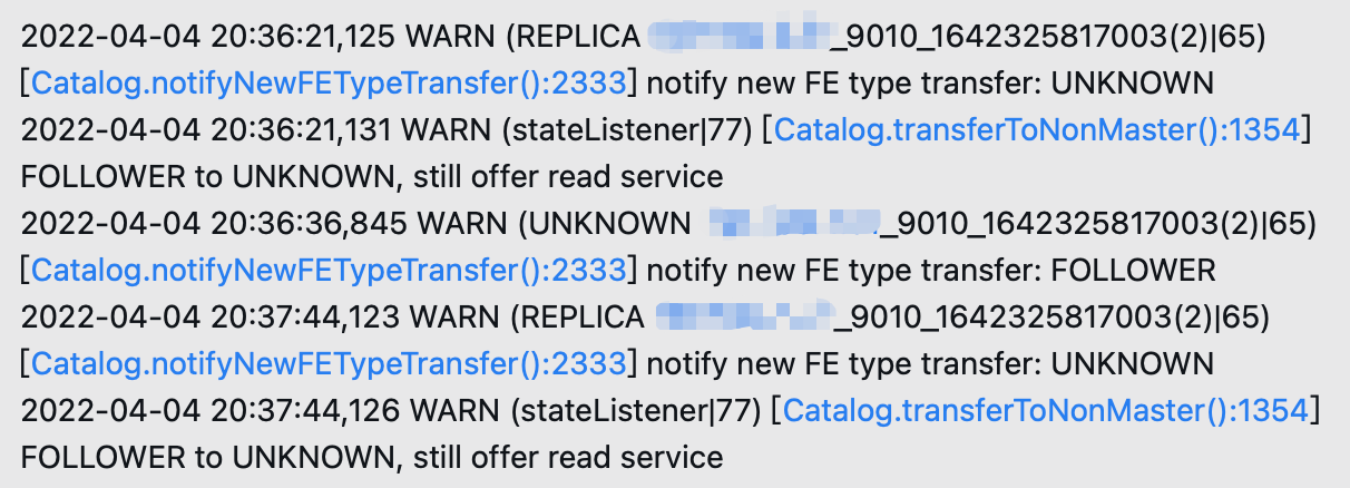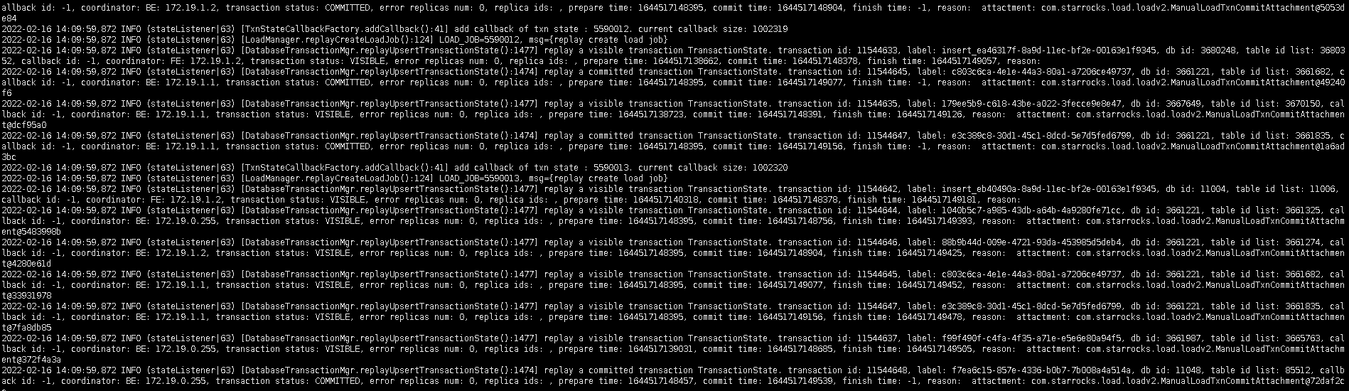 【详述】starrocks fe重启后,fe进程正常,但是客户端连接fe 9030端口拒绝,期间fe log 如下,等如下log刷完以后(持续时间大概1小时),客户端才能连接