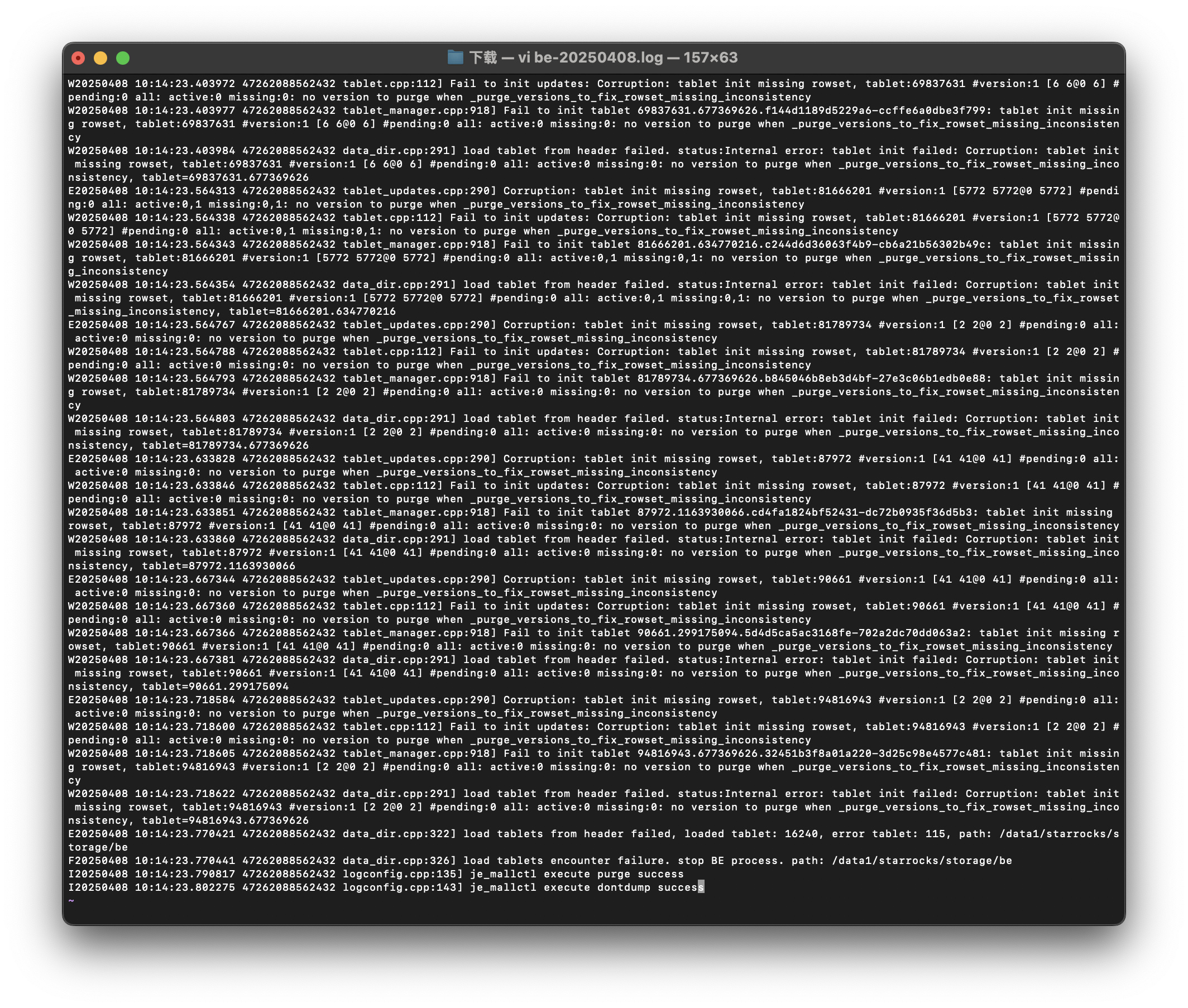 F20250408 10:14:23.770441 47262088562432 data_dir.cpp:326] load tablets encounter failure. stop BE process. path: /data1/starrocks/storage/be