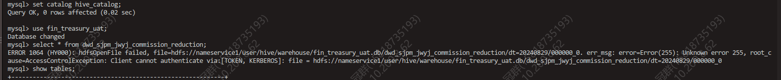 ERROR 1064 (HY000): hdfsOpenFile failed, file=hdfs://nameservice1/user/hive/warehouse/dwd_crb.db/dwd_tpm_tp_protocoltermination_df/000001_0. err_msg: error=Error(13): Permission denied, root_cause=RemoteException: org.apache.hadoop.security.AccessControlException: SIMPLE authentication is not enabled. Available:[TOKEN, KERBEROS]: file = hdfs://nameservice1/user/hive/warehouse/dwd_crb.db/dwd_tpm_tp_protocoltermination_df/000001_0
