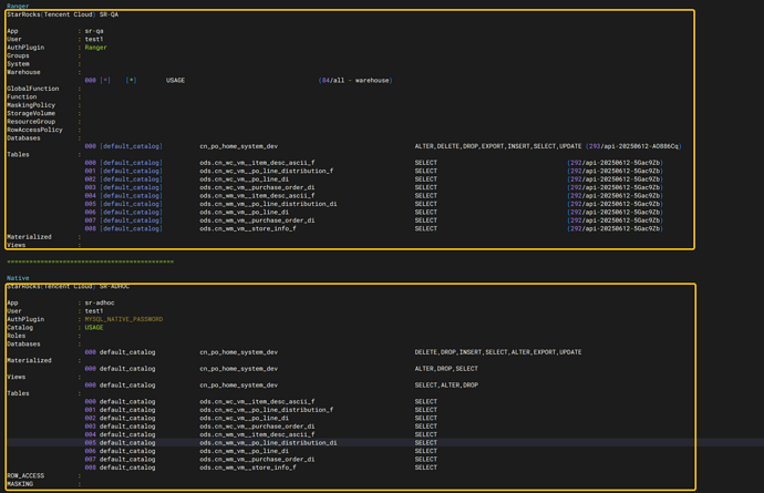 - 支持直观查看StarRocks内部权限,查看apache ranger中的policys