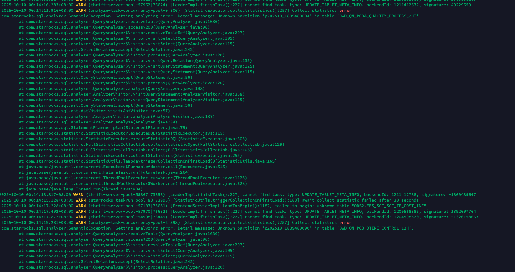 com.starrocks.sql.analyzer.SemanticException: Getting analyzing error. Detail message: Unknown partition ‘p20251009_1889476238’ in table ‘DWS_QM_PCBA_UNIT_ITEM_CHECK_DI’.