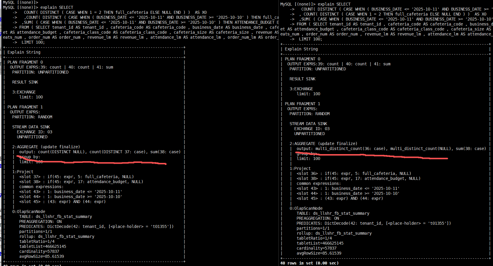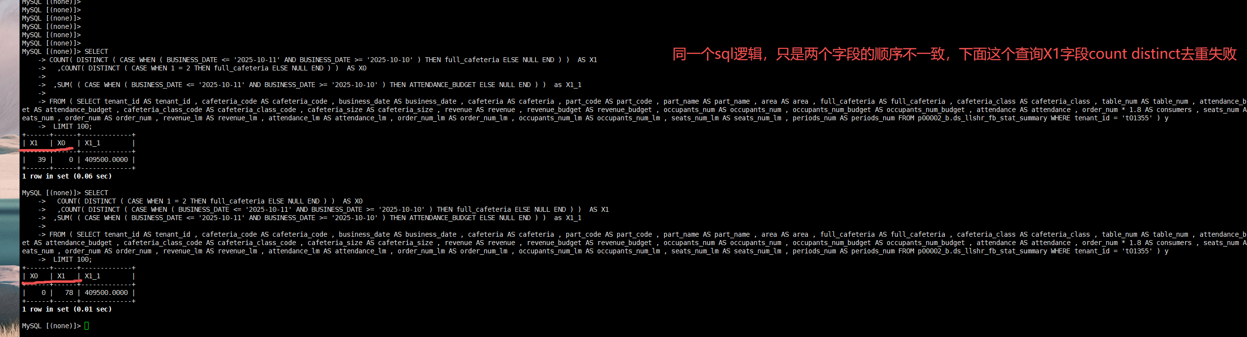 【详述】同一个sql,只是查询字段顺序不一致,count_distinct字段查询出来的结果不一样,X1字段的distinct失效了