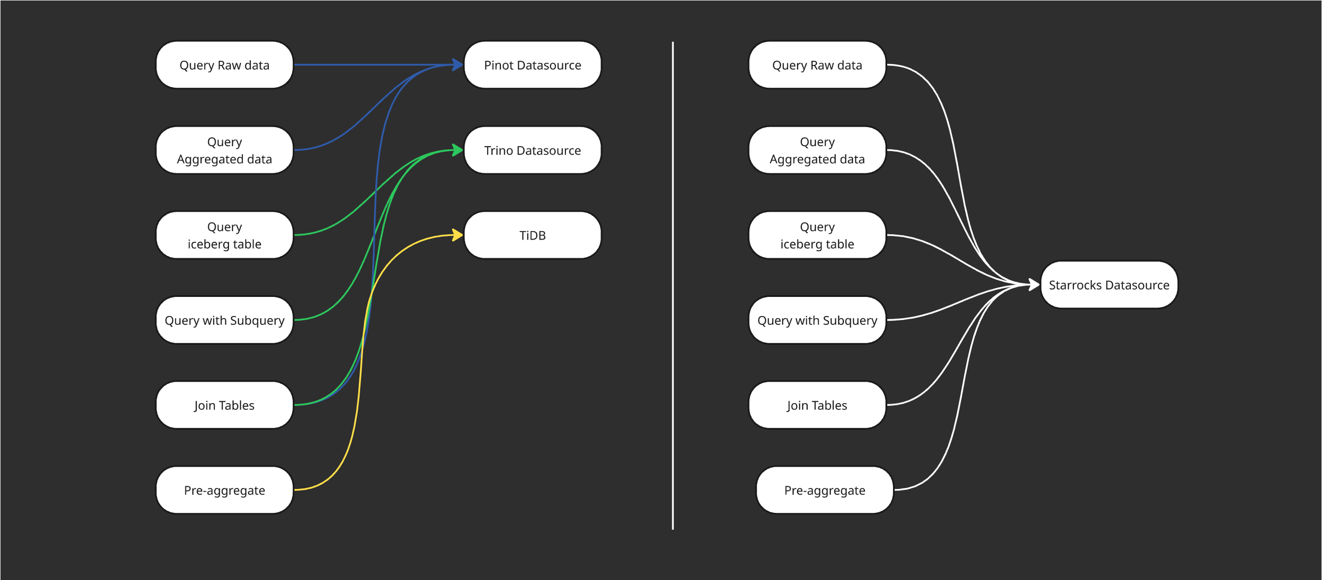 这种分离式架构给运维带来了显著挑战。当 Pinot 出现异常时,我们无法通过 Query Metrics 快速定位问题,也无法进行有效的故障排查。而在 StarRocks 中,算子可直接下推至存储层执行,查询性能更优,且所有的查询有统一的管理位置,便于产线问题的排查和定位。