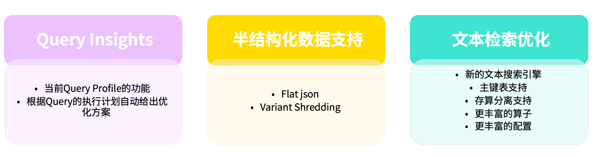 我们计划在现有社区提供的 Query Profile 基础上,进一步完善查询洞察体系,使系统能够更清晰地展示 SQL 各算子的执行耗时。此外,还将引入智能优化建议机制,当某些算子执行时间过长时,系统能够自动给出潜在的优化方案。