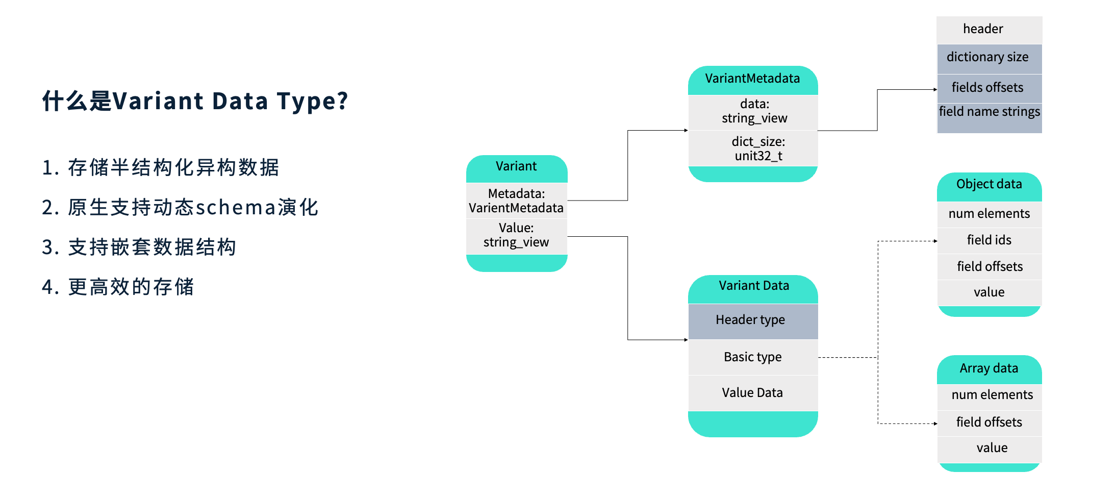 除了基础类型外,Variant 还支持 Object 与 Array 等复杂结构。以实际应用为例,当创建包含 Variant 字段的表并将数据写入 Parquet 文件时,其 Schema 结构会分为两部分(如上图右侧所示):