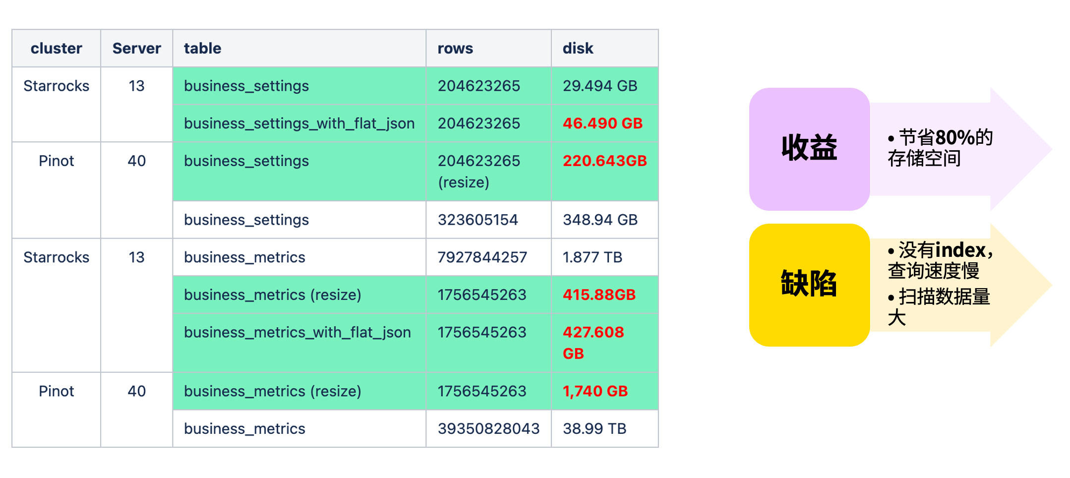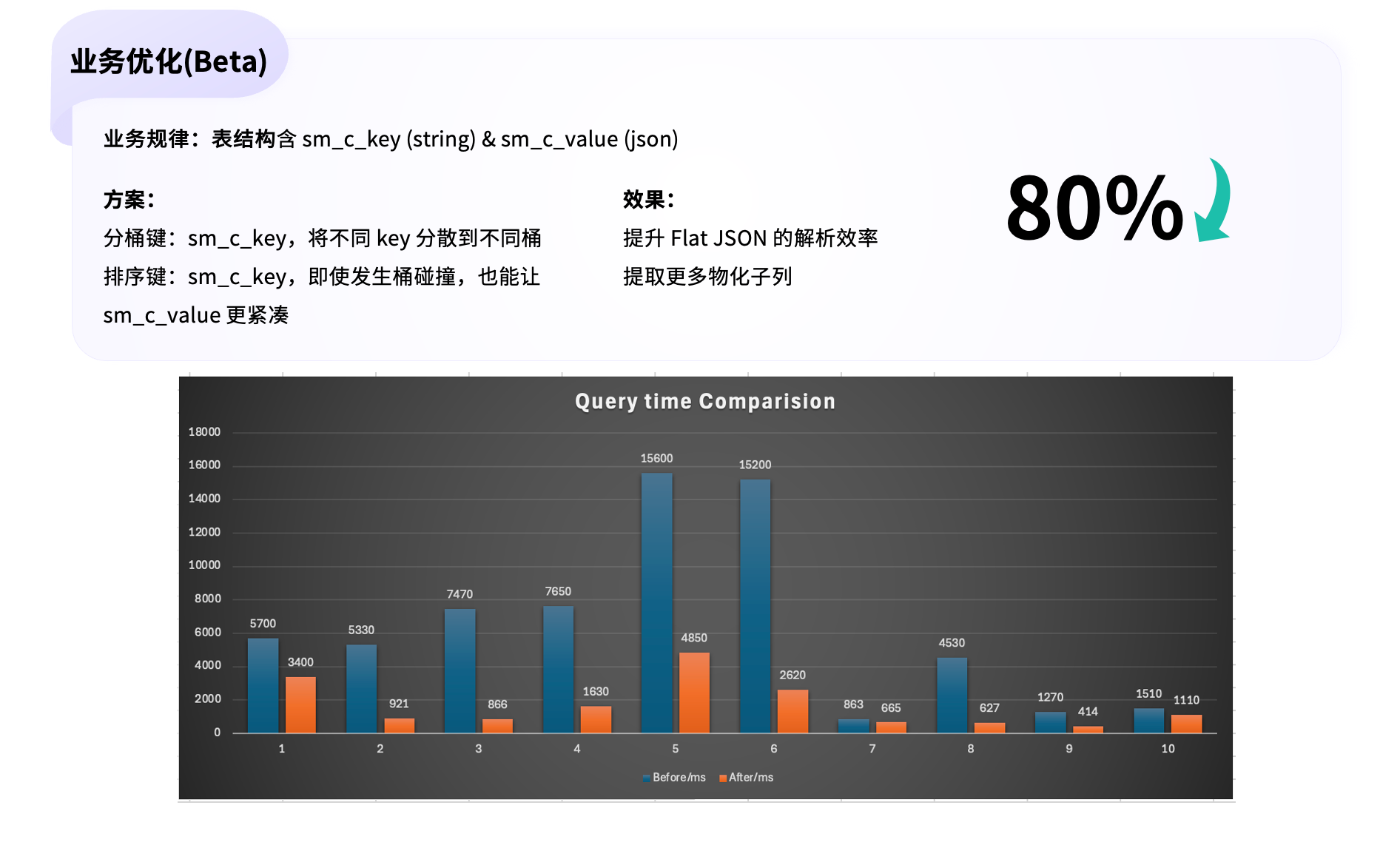 - Flat JSON 优化后磁盘占用降低 80% ,查询时延减少 80% ;