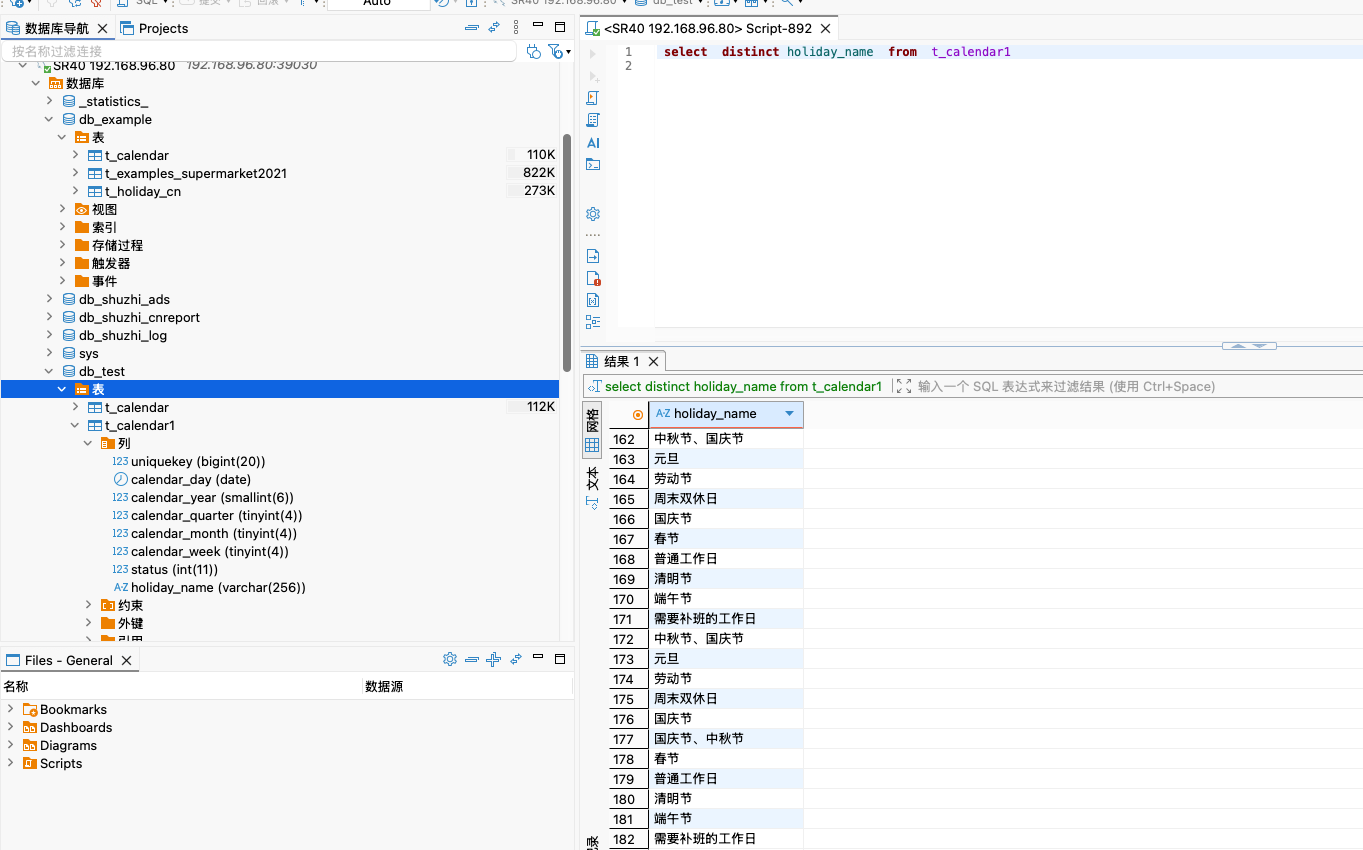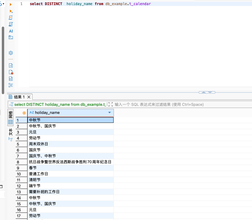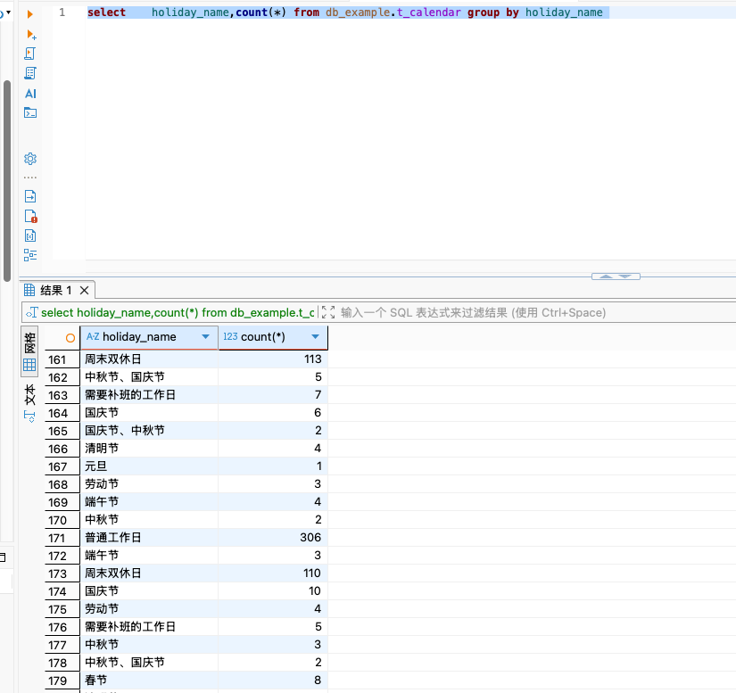 1.select holiday_name,count(*) from db_example.t_calendar group by holiday_name ;