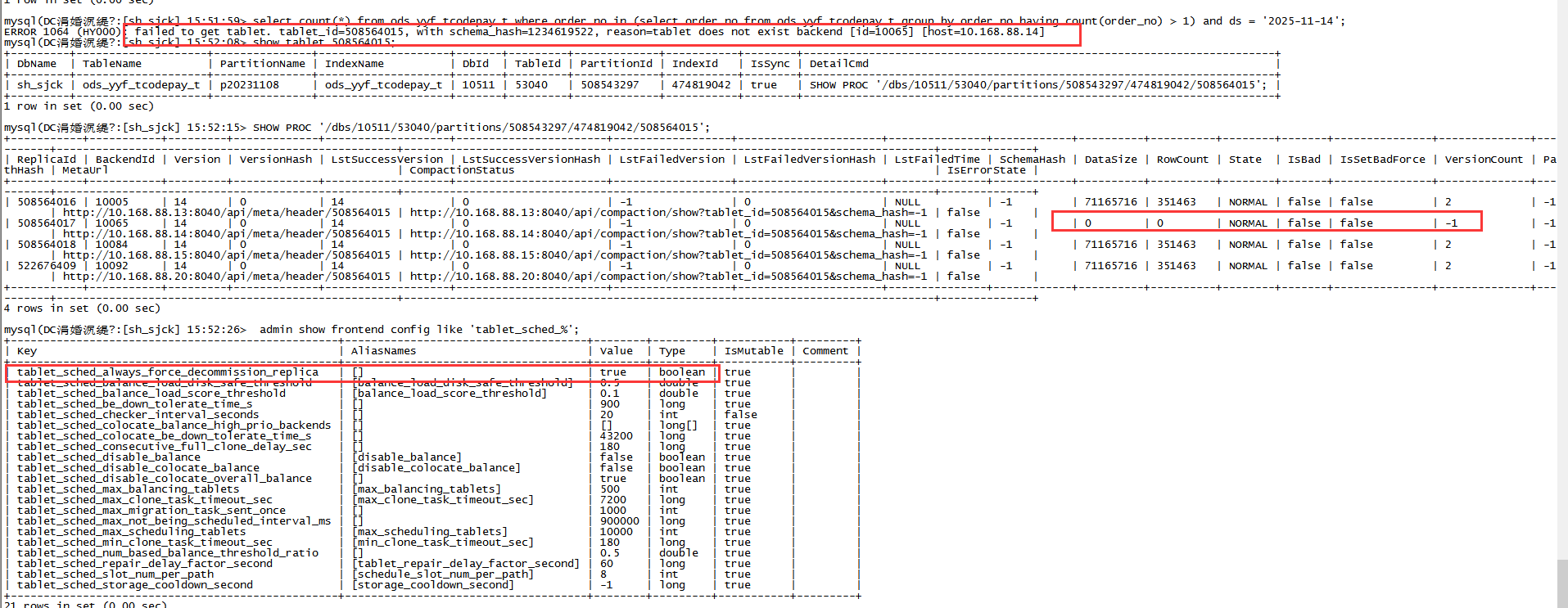 ERROR 1064 (HY000): failed to get tablet. tablet_id=328595869, with schema_hash=424008707, reason=tablet does not exist backend [id=10065] [host=10.168.88.14]