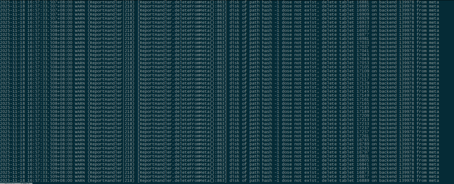 2025-11-18 16:57:33.508+08:00 WARN (ReportHandler|218) [ReportHandler.deleteFromMeta():863] disk of path hash -1 dose not exist, delete tablet 16845 on backend 139978 from meta