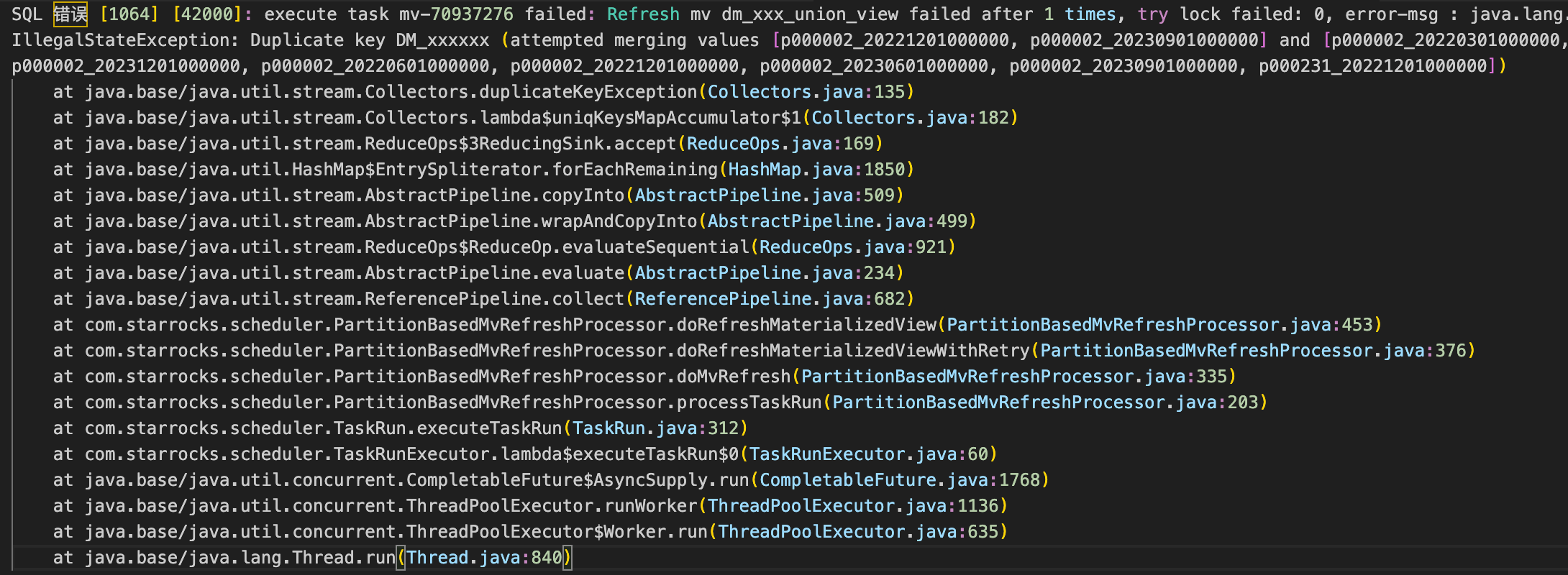 【详述】构建分区物化视图main_view无报错(但是数据刷新的不全),但是全量刷新就会报错分区键值(code字段为分区键)merge冲突,其select结构是