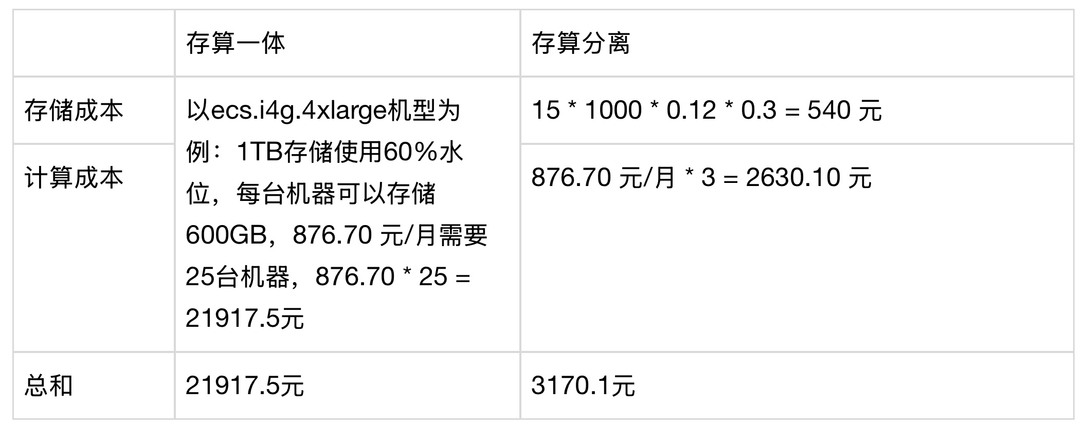 在两轮业务方的虎克平台中,单表日写入量约 1TB。为应对高数据量写入与存储成本问题,团队采用存算分离构,以阿里云 OSS 作为底层存储介质。 测算结果显示,与存算一体架构相比,整体成本下降超过 80%: