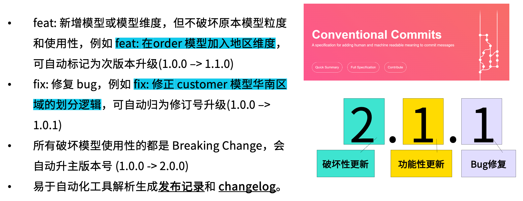 以一个具体示例来说明:如果某次变更属于功能性更新,例如在 order 模型中新增了一个维度字段,那么对应的版本号会在中间位上递增,例如从 2.0 升级到 2.1,此类变更通常保持向后兼容(backward compatibility);而针对缺陷修复(bug fix),则只会提升尾号,例如从 2.1.0 升级到 2.1.1。