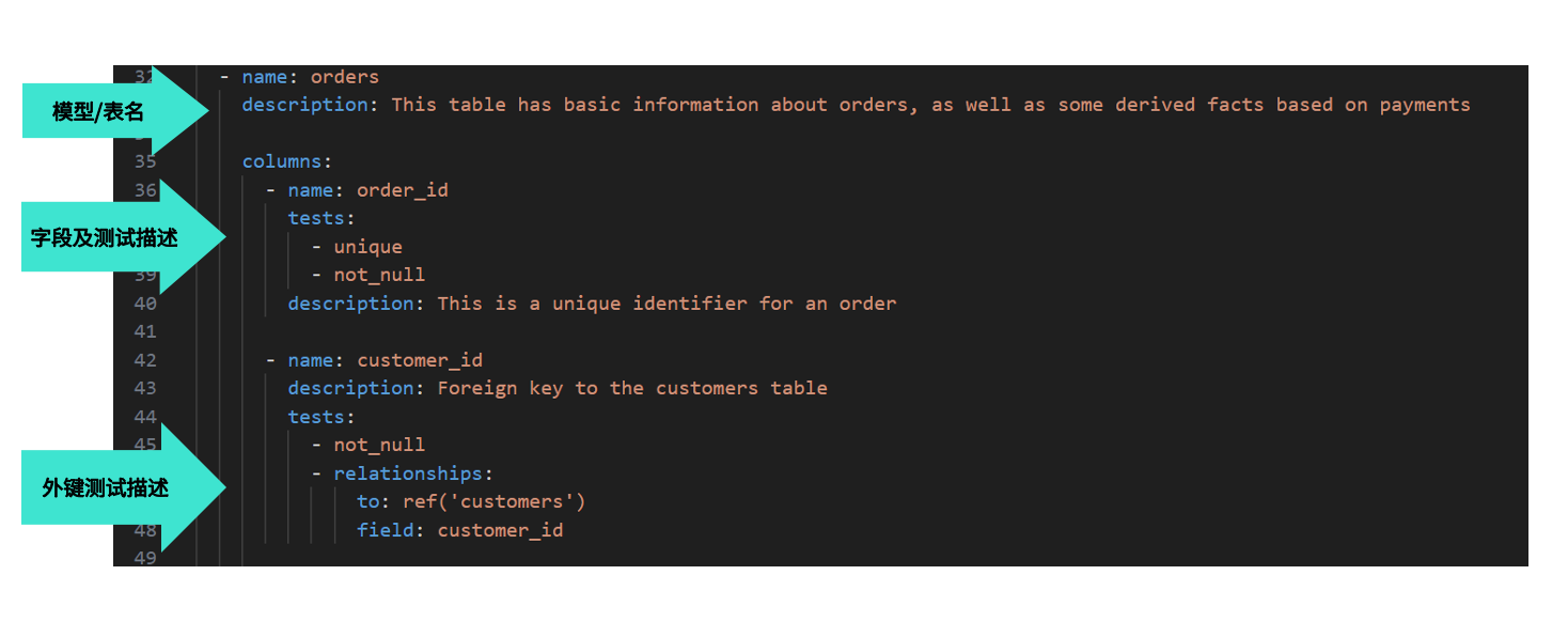 在具体实现上,dbt 的模型描述文件通常采用 YAML 格式编写。每个模型会定义名称(name)和描述信息(description),用于说明该模型的用途与业务含义;在此之下则是字段级的配置。针对字段,dbt 内置了多种测试工具,例如 unique、not_null 等,可用于校验字段是否唯一、是否存在空值等基础质量规则。