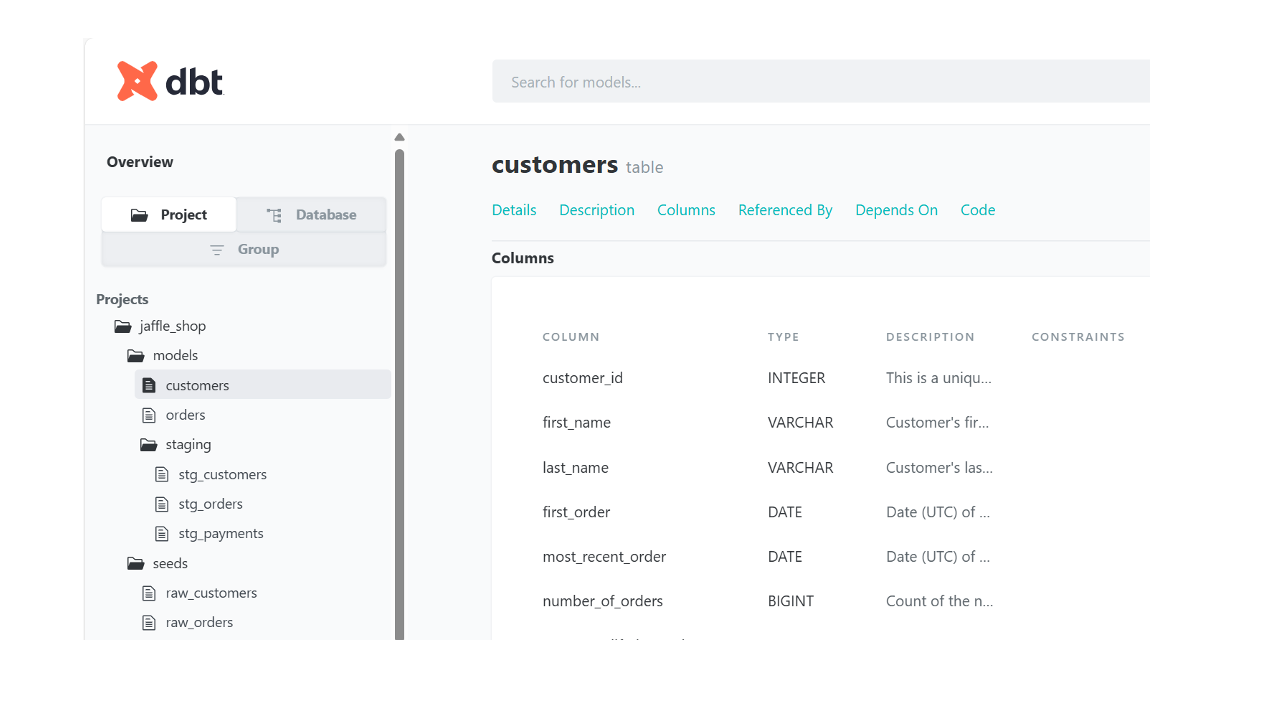 在文档与资产管理层面,dbt 还可以自动生成数据字典等文档资产。通过 dbt 生成的 HTML 文档,团队可以查询各类字段的定义和含义,查看对应的代码实现以及上下游依赖关系(dependencies),并且可以根据企业品牌规范自定义 Logo 和展示样式。