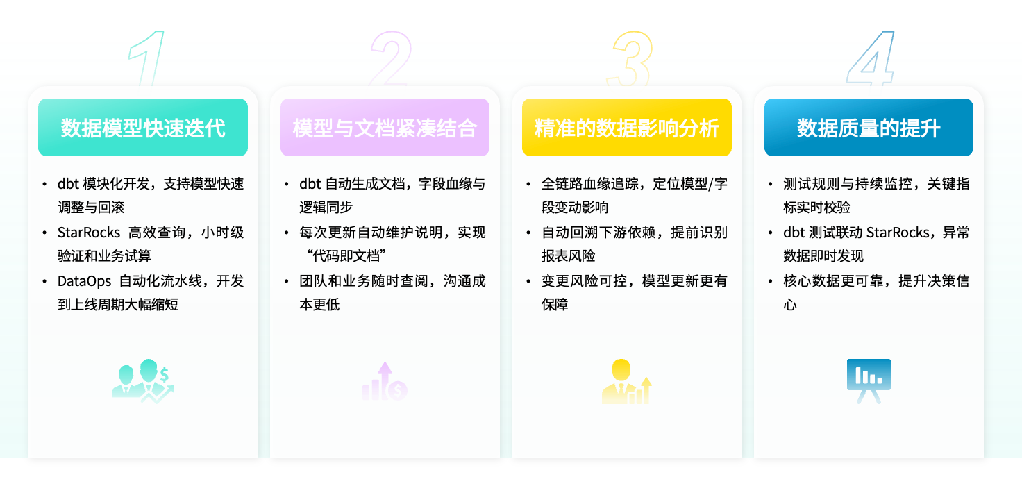 在此基础上,通过 dbt + DataOps + StarRocks 构建的“三合一”数据体系,为企业带来了以下几方面的直接收益: