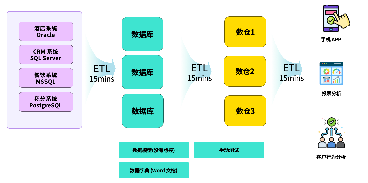 在 StarRocks 的实践中,团队重点改造了批处理与实时分析的整体链路。以某酒店行业场景为例,其早期采用的是相对孤立的 ETL 框架:底层存在多个不同的业务数据库,ETL 任务定时(例如每 15 分钟)从这些数据库抽取数据,分别写入多个数仓系统,同时还为手机 App 和各类报表分析系统提供数据支撑。此类架构的核心问题在于:数据模型缺乏版本控制,整体较为脆弱,变更后容易“改坏”;测试主要依赖人工校验,难以形成稳定的质量保障机制;文档以分散的 Word 文件为主。
