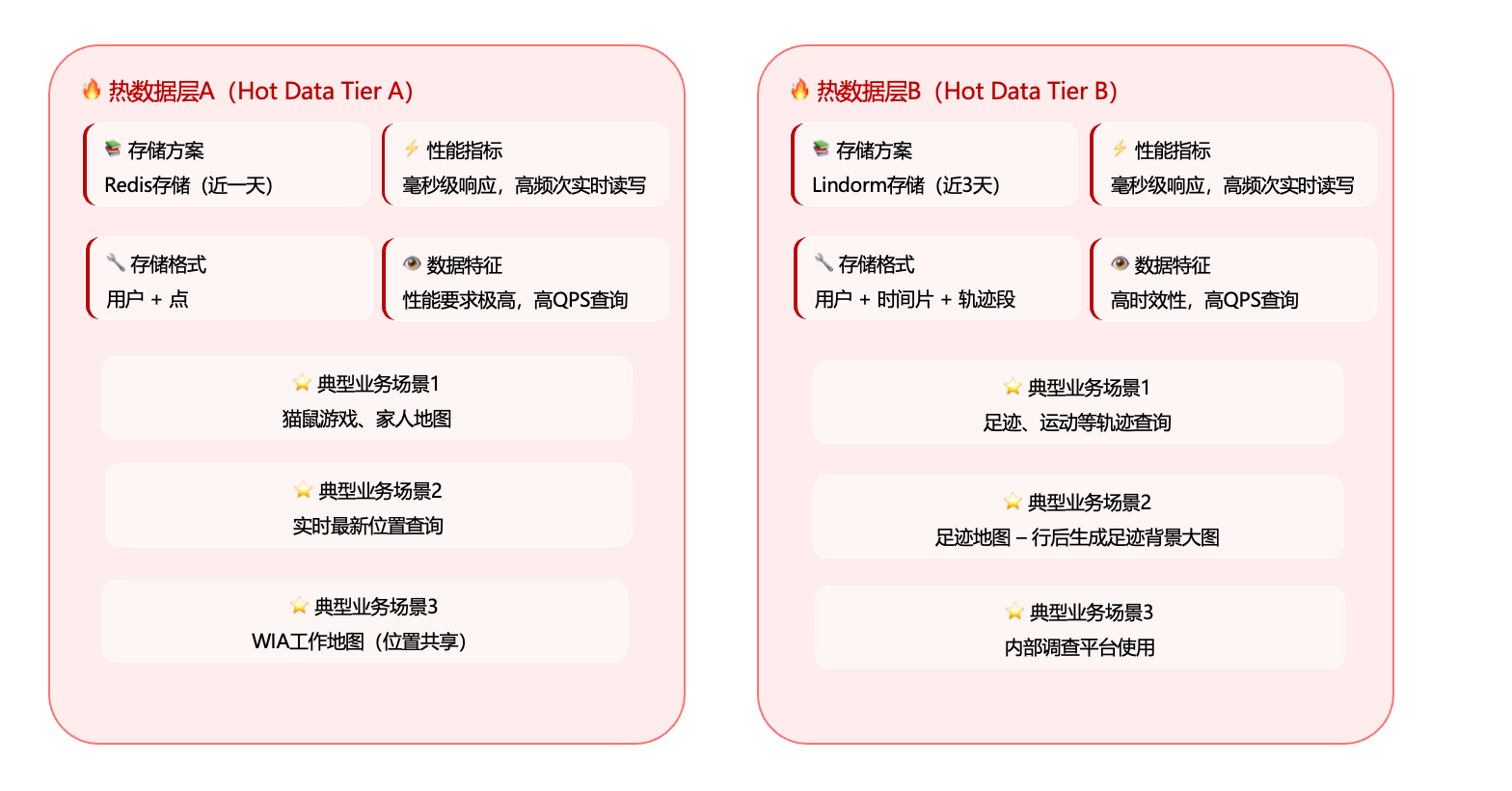 - 典型场景:足迹/运动等近三天轨迹查询;同时也支撑部分内部调查平台使用,以及实时轨迹匹配等能力的在线调用。