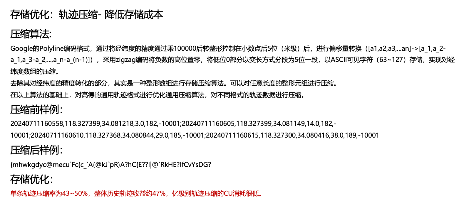 经过压缩后,轨迹数据会被编码为一段紧凑的字符串(形态上类似“乱码”)。从效果来看,单条轨迹的压缩率可达到 43%–50% ;轨迹越长,压缩效果越明显。整体而言,高德轨迹数据全面应用该压缩方案后,综合收益约为 47% 。在性能方面,该压缩算法具备较好的资源效率:即便在 亿级轨迹 的压缩规模下,CPU 资源消耗仍保持在较低水平。