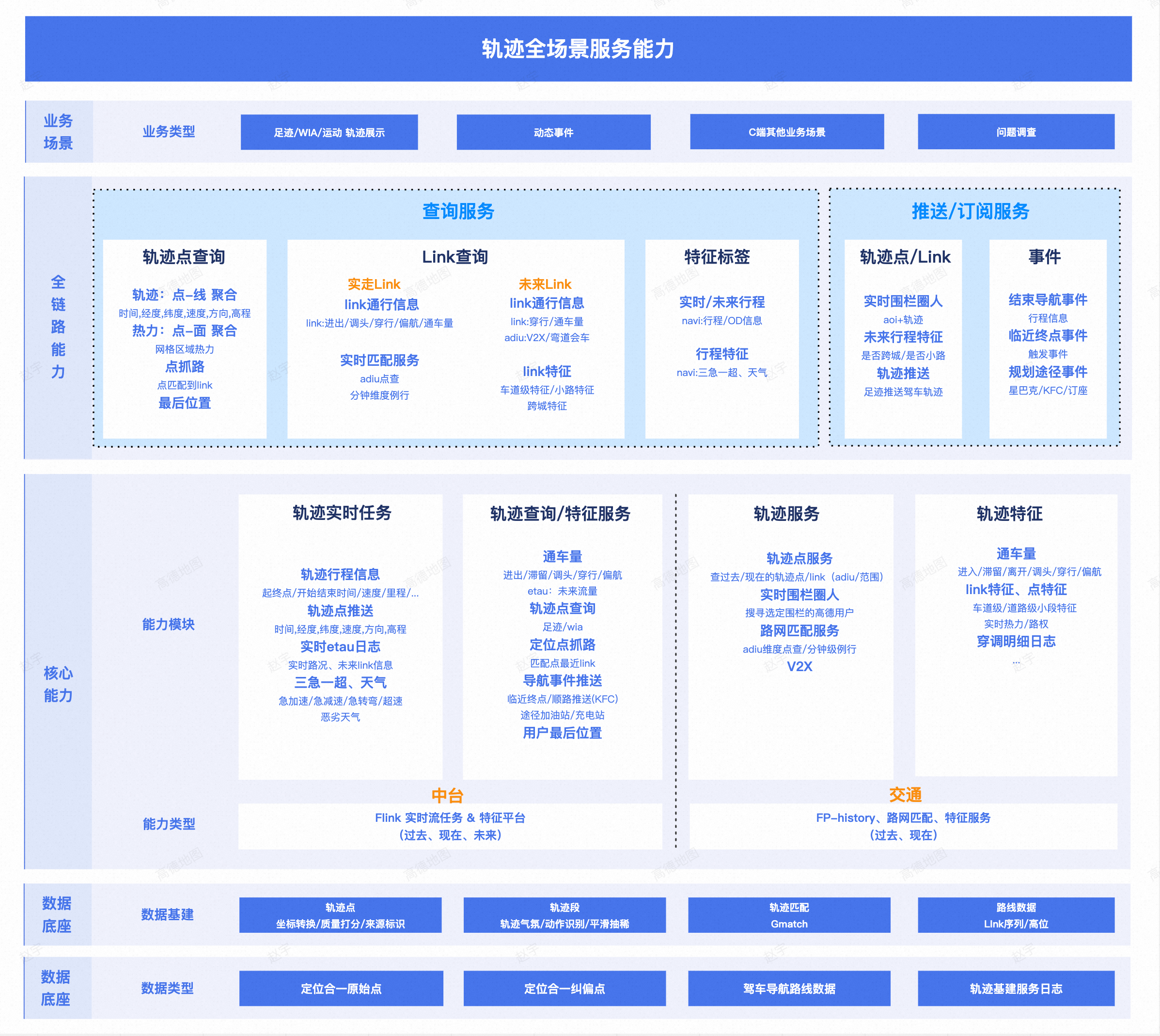 从最底层的轨迹原始点数据出发,经由 ETL 加工与清洗,沉淀形成轨迹领域的基础数据资产,包括轨迹点、轨迹段、轨迹匹配结果,以及离线数据等。
