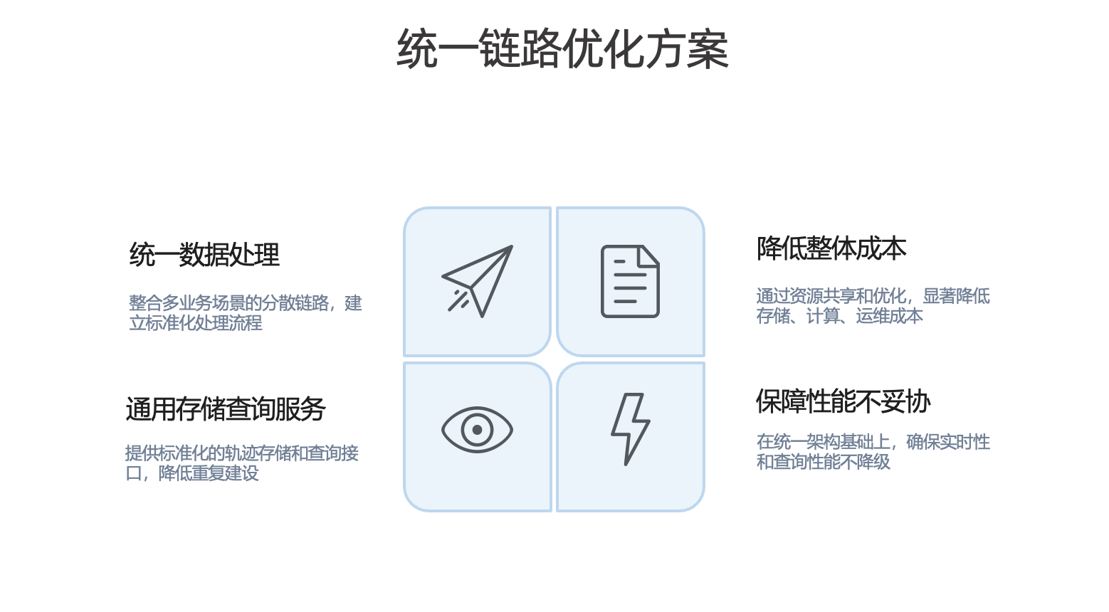 - 建设通用存储与查询服务。 提供标准化的轨迹存储能力与统一查询接口,减少重复建设。