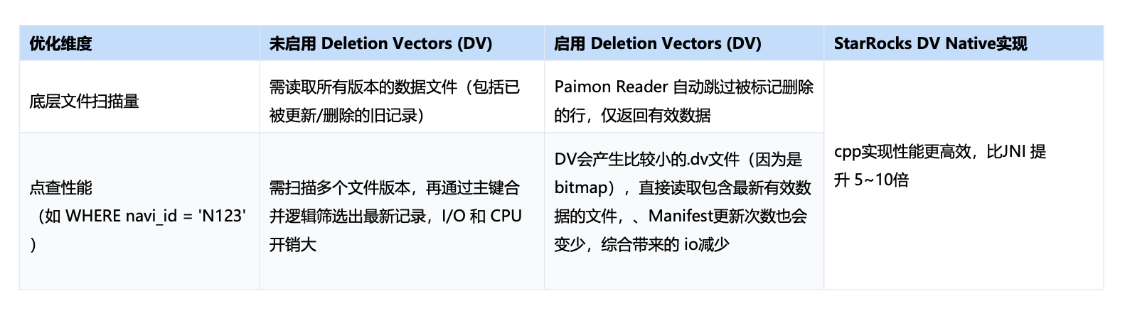 此外,该表开启了 DV(Deletion Vector)相关能力:当 Reader 读取开启 DV 的表时,可自动跳过已标记删除的行,仅返回最新有效数据;同时,Manifest 的更新频次也会降低,综合带来 I/O 的进一步减少。配合 StarRocks 的 DV Native 实现(C++),整体执行效率相较 JNI 路径可获得显著提升(可达到 5 倍以上)。