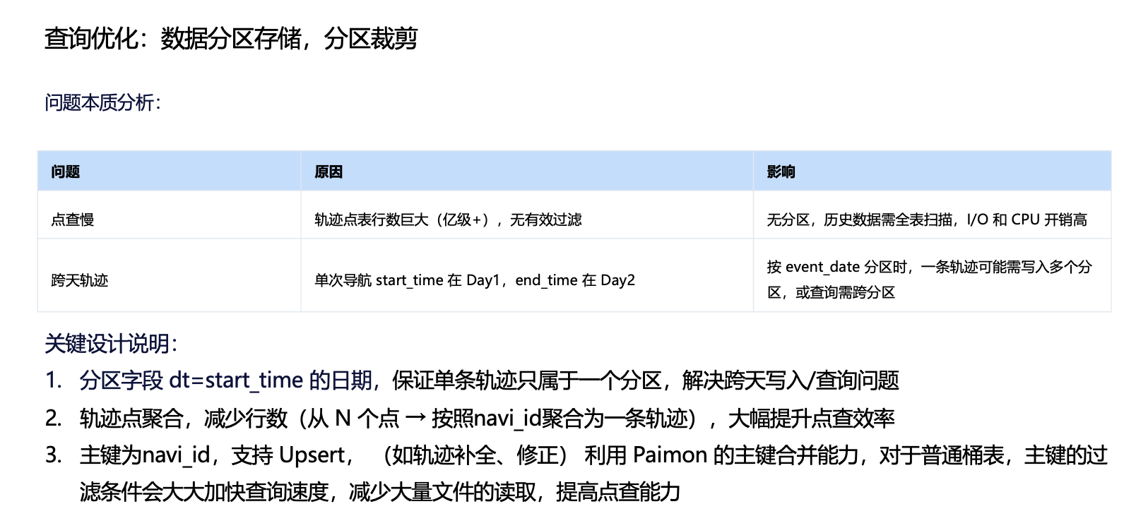 在表模型设计上,Paimon 表以轨迹 ID 作为主键。由于 Paimon 主键表支持 Upsert,我们可以利用其主键合并能力支持轨迹补全与数据修复等场景;同时,主键过滤条件也能够显著加速查询。