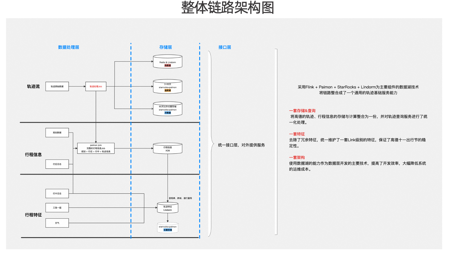 整体链路的架构示意图可按三层理解: 数据处理层、存储层与接口层 。