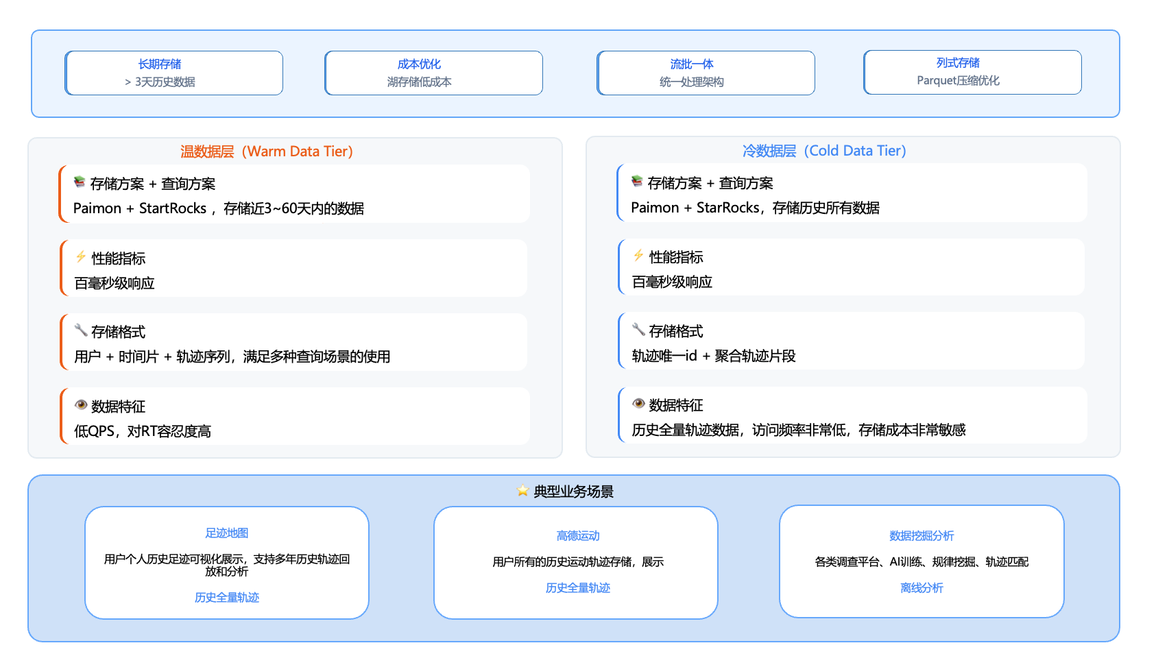 面对轨迹数据“高实时、高并发、长周期存储”的典型特征,高德团队以访问跨度为依据完成热/温/冷分层,并以 Apache Paimon + StarRocks 构建统一的数据底座,支撑轨迹数据的近实时写入与高性能查询。