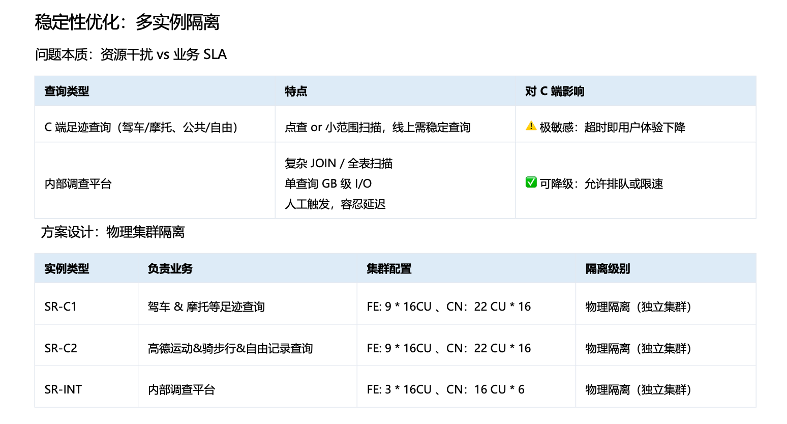 最后一类需要重点解决的是稳定性与资源隔离问题。前文提到,轨迹数据既服务于 C 端在线业务,也支撑内部调查平台等内部工具,两类业务在 SLA 与查询特征上存在明显差异,若缺乏隔离机制,容易产生资源干扰。