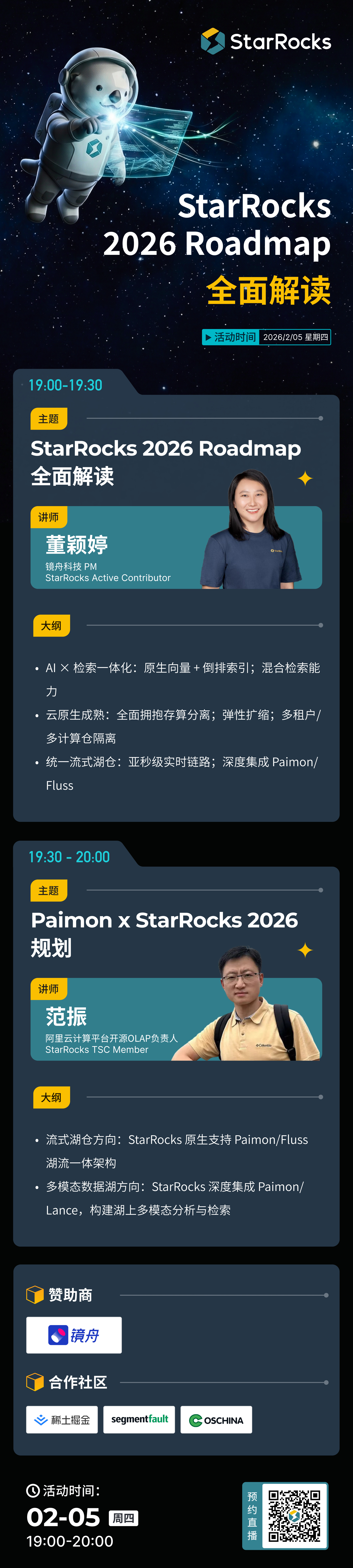 2026 年 2 月 5 日 19:00-20:00,社区邀请到 StarRocks Active Contributor 董颖婷带来 StarRocks 2026 Roadmap 全面解析,并邀请 StarRocks TSC Member 范振分享 Paimon × StarRocks 2026 规划 ,聚焦流式湖仓与多模态数据湖方向的下一步。