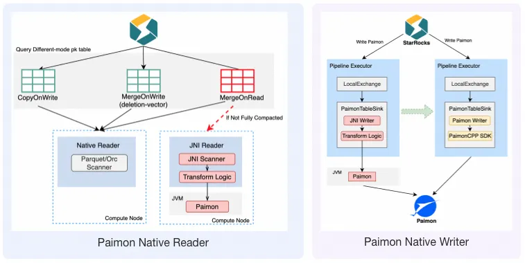 - Native Reader/Writer : 在未开启 DV 的情况下,MOR 表需要在查询时实时合并多个版本的增量数据,只能通过 JNI 调用 Java 层处理,存在类型转换、行列格式转换、JVM GC 等开销,效率低下且易引发 OOM。如今,StarRocks 基于 Paimon CPP SDK,在 BE 的 C++ 代码中直接实现 Paimon Native Scanner,实测显示 MOR 表读取性能提升超过 5 倍。写入侧同样受益,Native Writer 显著提升了写入吞吐。