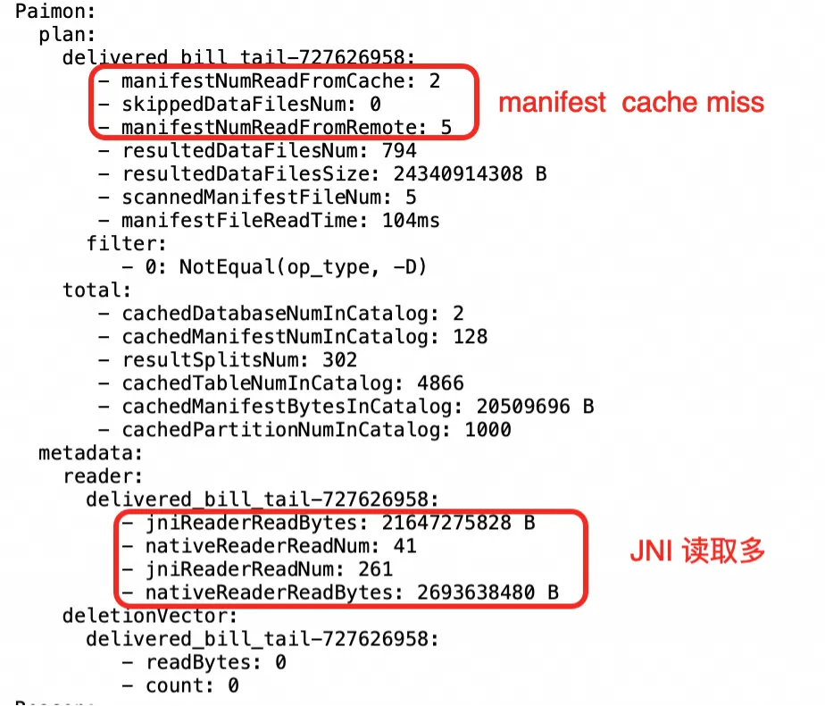 StarRocks 完善了 Profile 指标体系,覆盖 plan 与执行两个阶段。在 plan 阶段,用户可查看 manifest 缓存命中率、远程读次数、谓词下推效果及最终扫描文件数,用于判断是否需调大缓存或优化查询条件。在 BE 执行阶段,则能清晰区分 JNI 与 native 读取的比例——若 JNI 占比较高,可能提示需要对表进行 full compaction,或考虑切换至 DV 表模式。