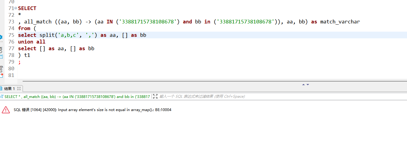 , all_match ((aa, bb) -> (aa IN ('33881715738108678') and bb in ('33881715738108678')), aa, bb) as match_varchar