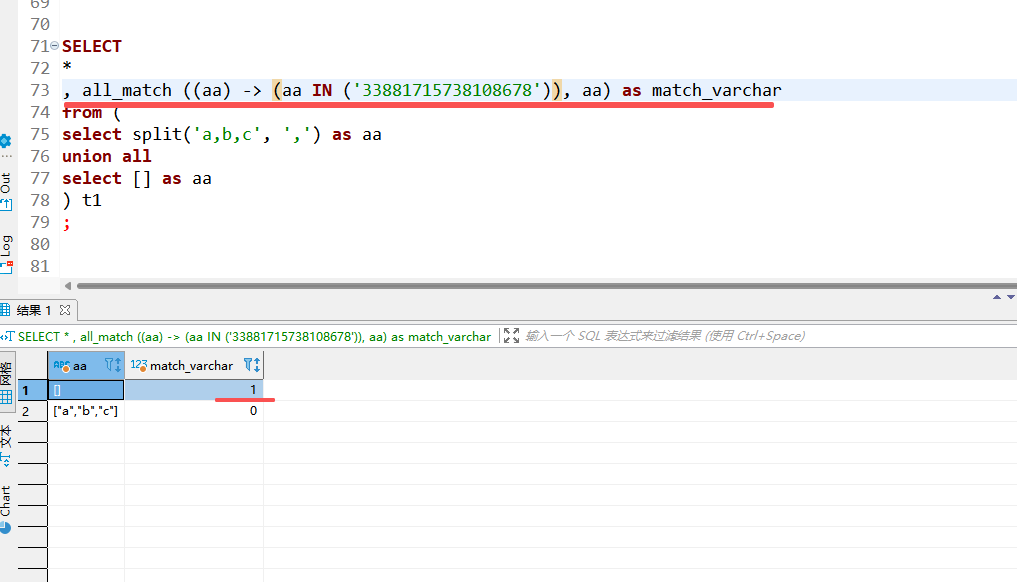 问题1:空数组使用lamba表达式判断时,查询结构是都满足,个人认为空数组呢条记录应该是不满足 in (‘33881715738108678’) 得。应该查询结果 match_varchar 列都是0