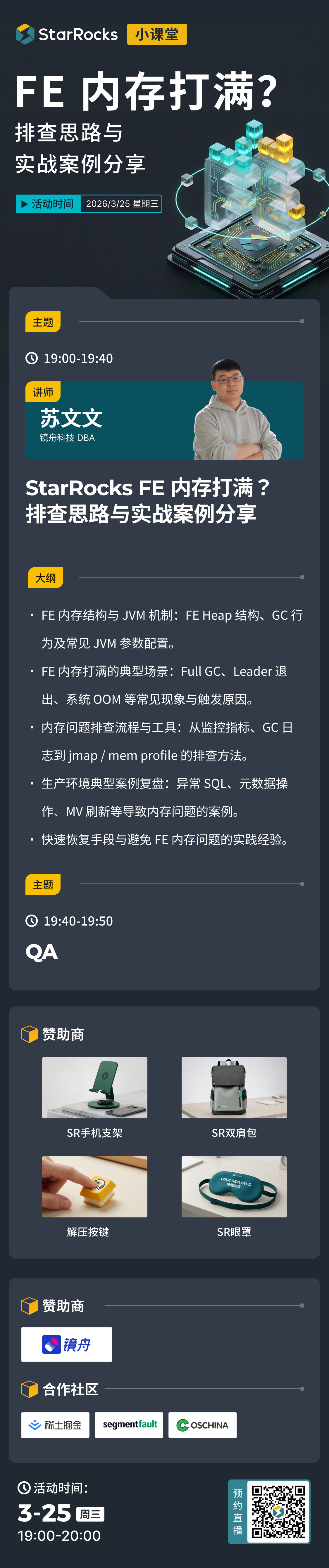 2026 年 3 月 25 日 19:00, 本期 StarRocks 小课堂将邀请镜舟科技DBA苏文文,主要基于 StarRocks 3.3 和 3.5 版本,结合真实生产 case,系统分享 FE 内存问题的分析框架与排查方法。