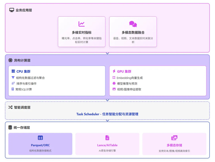 计算引擎需从单一的 CPU 架构向 CPU/GPU 异构架构演进。系统应具备智能调度能力,根据任务类型自动分配计算资源,实现结构化查询与非结构化推理的混合执行。