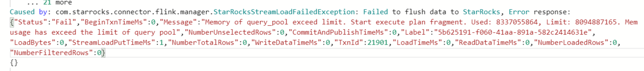 【详述】flink写入starrocks内存溢出:{“Status”:“Fail”,“BeginTxnTimeMs”:0,“Message”:“Memory of query_pool exceed limit. Start execute plan fragment. Used: 8337055864, Limit: 8094887165. Mem usage has exceed the limit of query pool”,“NumberUnselectedRows”:0,“CommitAndPublishTimeMs”:0,“Label”:“5b625191-f060-41aa-891a-582c2414631e”,“LoadBytes”:0,“StreamLoadPutTimeMs”:1,“NumberTotalRows”:0,“WriteDataTimeMs”:0,“TxnId”:21901,“LoadTimeMs”:0,“ReadDataTimeMs”:0,“NumberLoadedRows”:0,“NumberFilteredRows”:0}