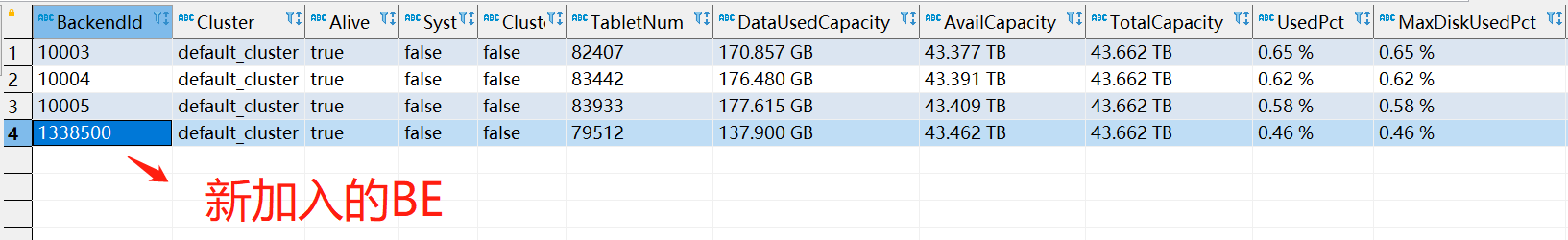 【详述】之前3台fe,3台be,后加入一台be后,数据正常分布到此BE,但是SQL查询时,这台新加入的BE没有参与查询任务