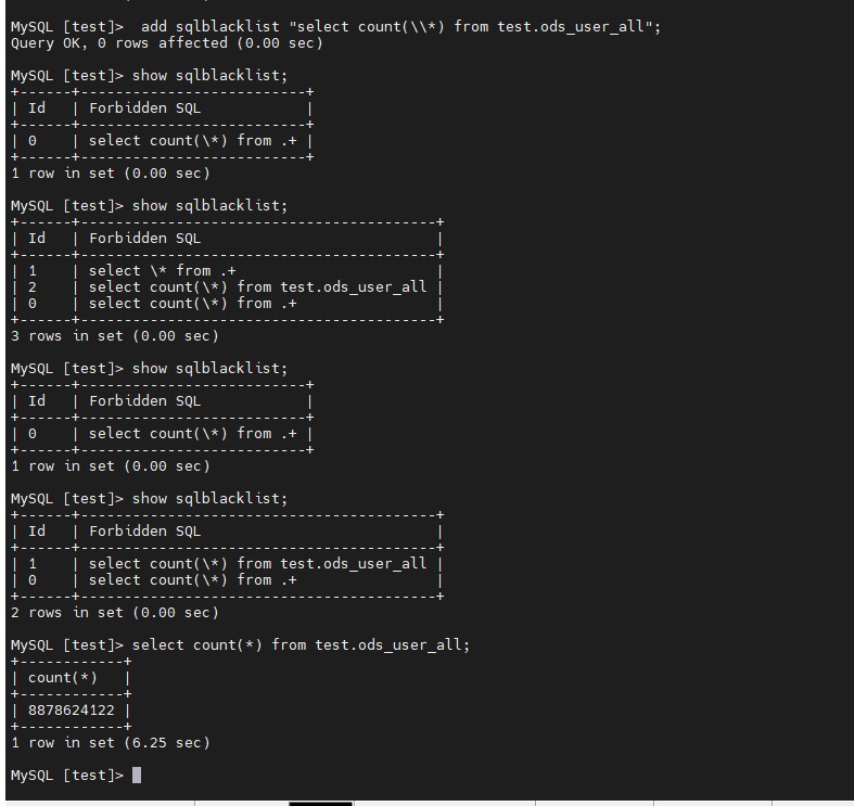 MySQL [test]> add sqlblacklist “select count(\*) from test.ods_user_all”;