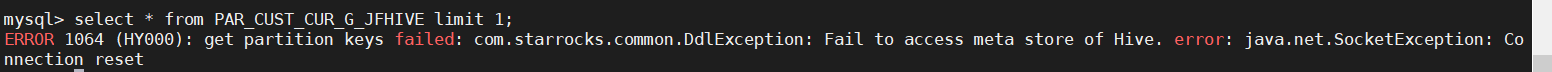 com.starrocks.sql.common.StarRocksPlannerException: get partition keys failed: com.starrocks.common.DdlException: Fail to access meta store of Hive. error: java.net.SocketTimeoutException: Read timed out