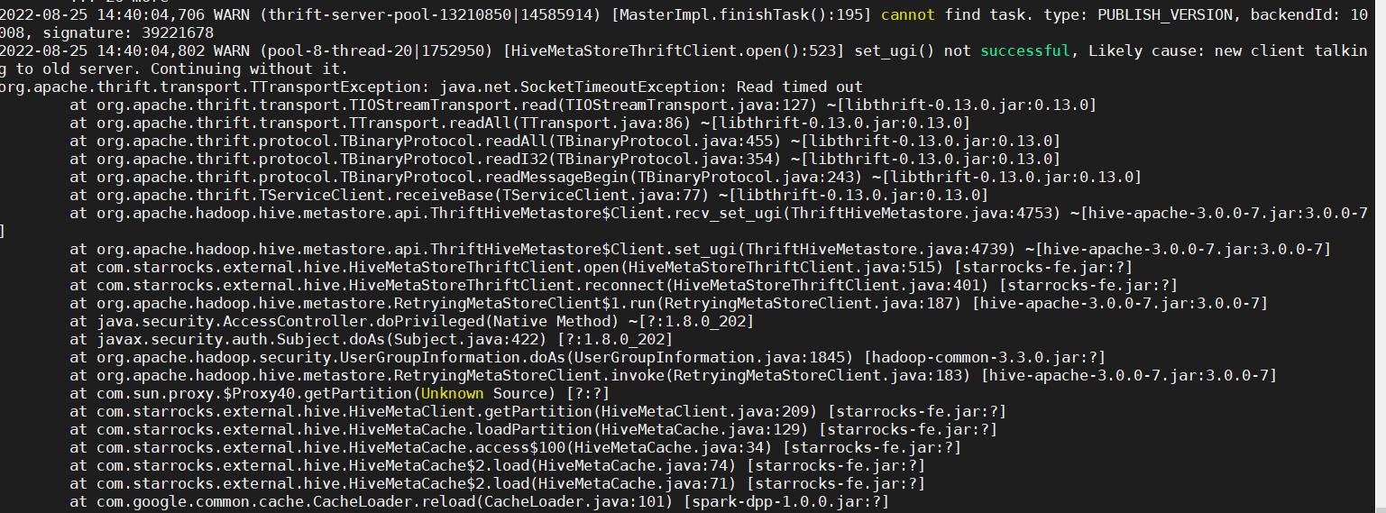2022-08-29 10:09:00,330 WARN (starrocks-mysql-nio-pool-9696|24702) [HiveMetaClient.getPartitionKeys():191] Fail to access meta store of Hive