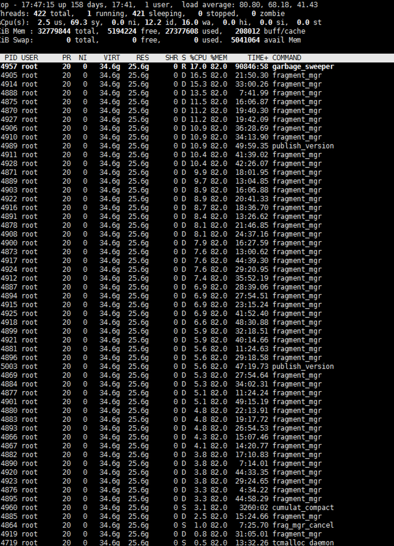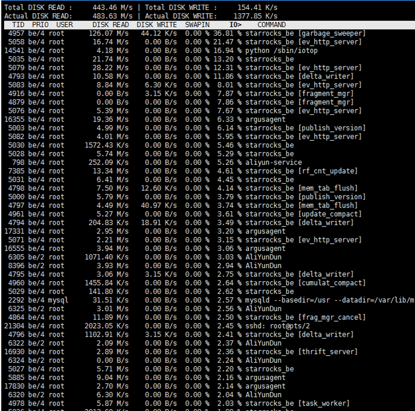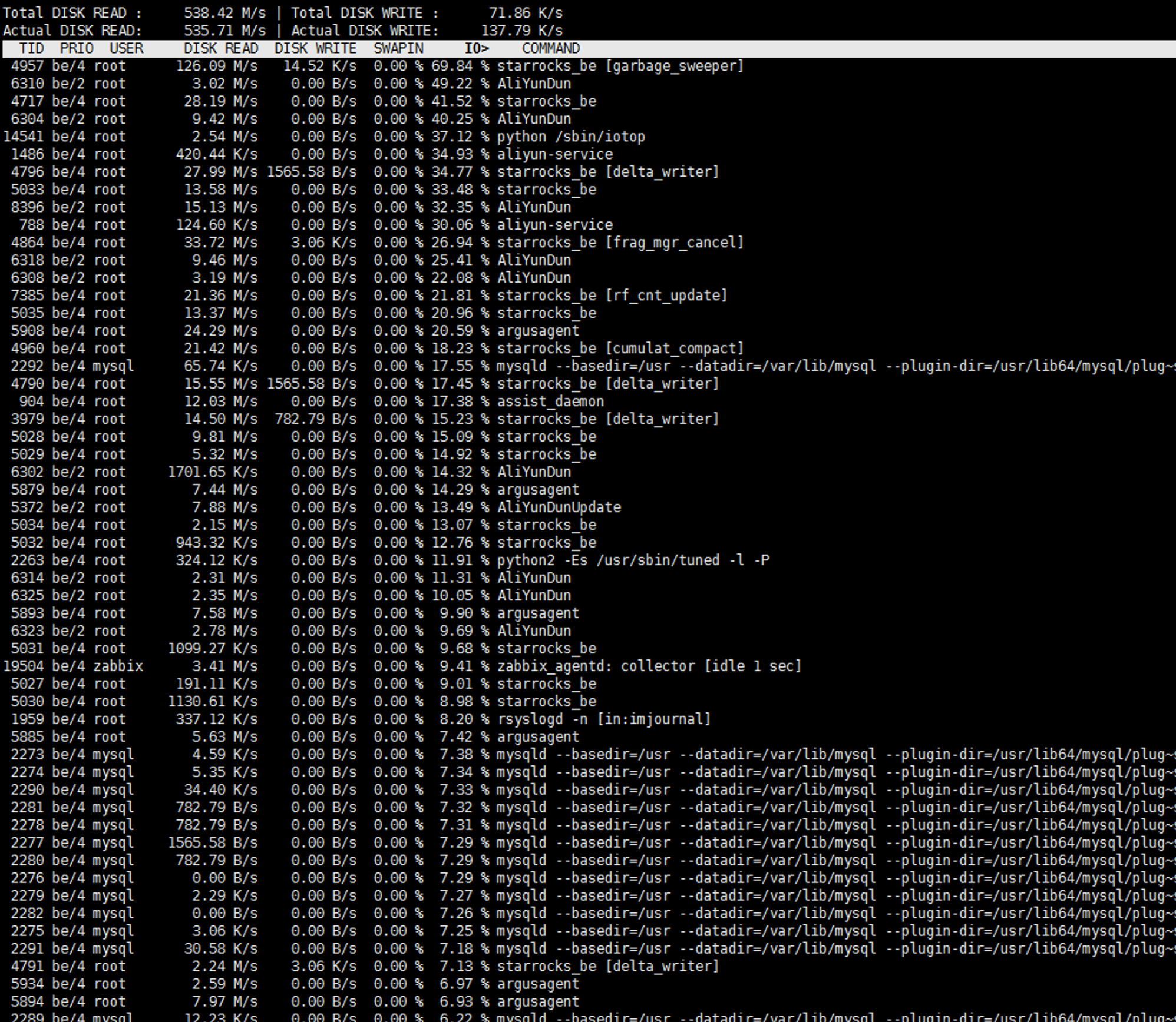 楼主,最后解决了吗?我这现在也是碰到一个 BE节点负载高,其它BE 节点正常,磁盘的IO 超高400MB/s 不知道在做什么