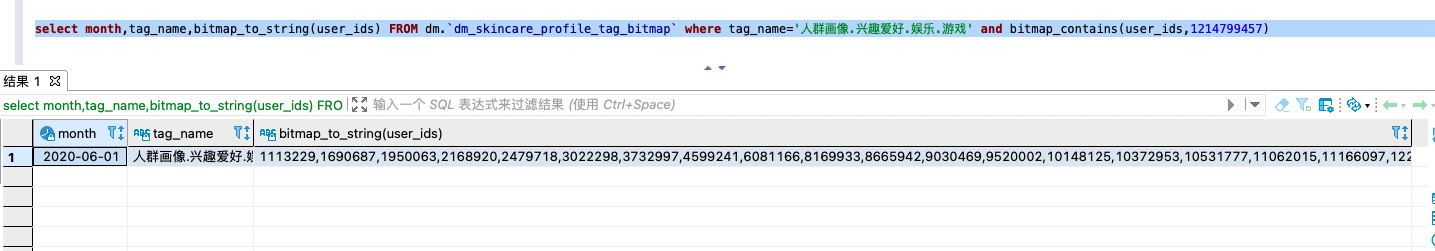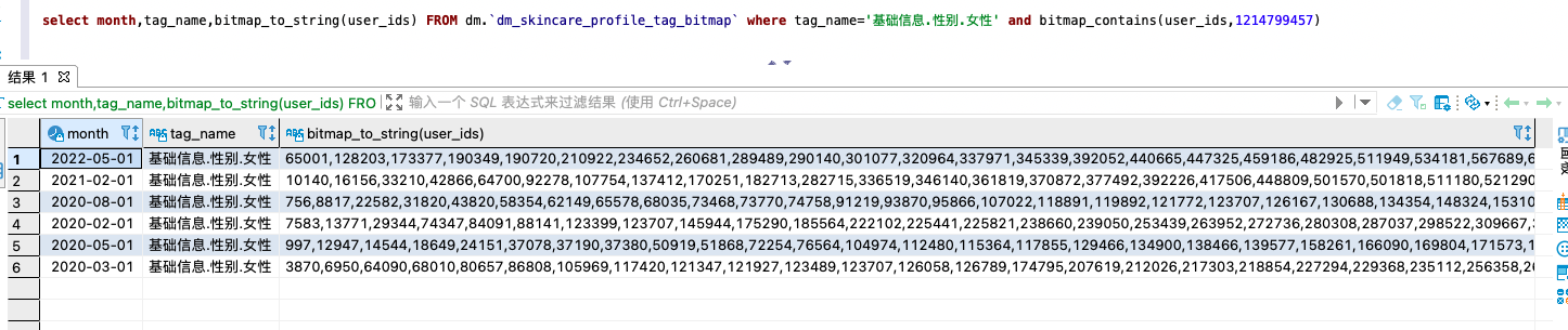 dm_skincare_profile_tag_bitmap (month date NOT NULL COMMENT “月份”,tag_name varchar(150) NOT NULL COMMENT “标签名称”,user_ids BITMAP BITMAP_UNION NOT NULL COMMENT ‘用户id’) ENGINE=OLAP