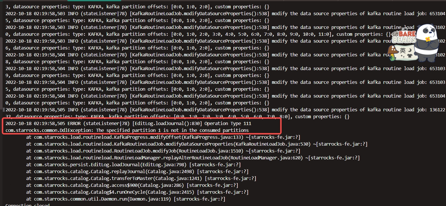 执行了alter routine load语句后,导致fe都挂了,报错Operation type 111,查了下源码 111 是执行alter语句报错。我猜测错误原因是 是执行了 alter routine load语句。类似这样的alter ROUTINE LOAD FOR dm.screenshot FROM kafka (“kafka_partitions”=“0,1,2”,“kafka_offsets”=“0,0,0”);然后kafka实际分区数是5个,我们脚本是3个。不一致。导致的报错。