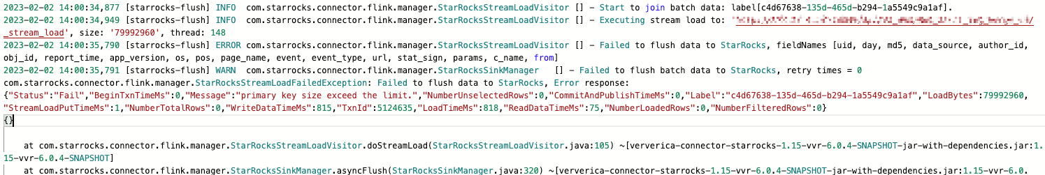 Flink导入StarRocks primary key size exceed the limit.