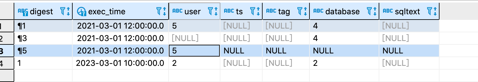 “INSERT INTO ass_monitoring_test SELECT ‘5’, ‘2021-03-01 12:00:00’, ‘5’, ‘NULL’, ‘NULL’, ‘NULL’, ‘NULL’”);